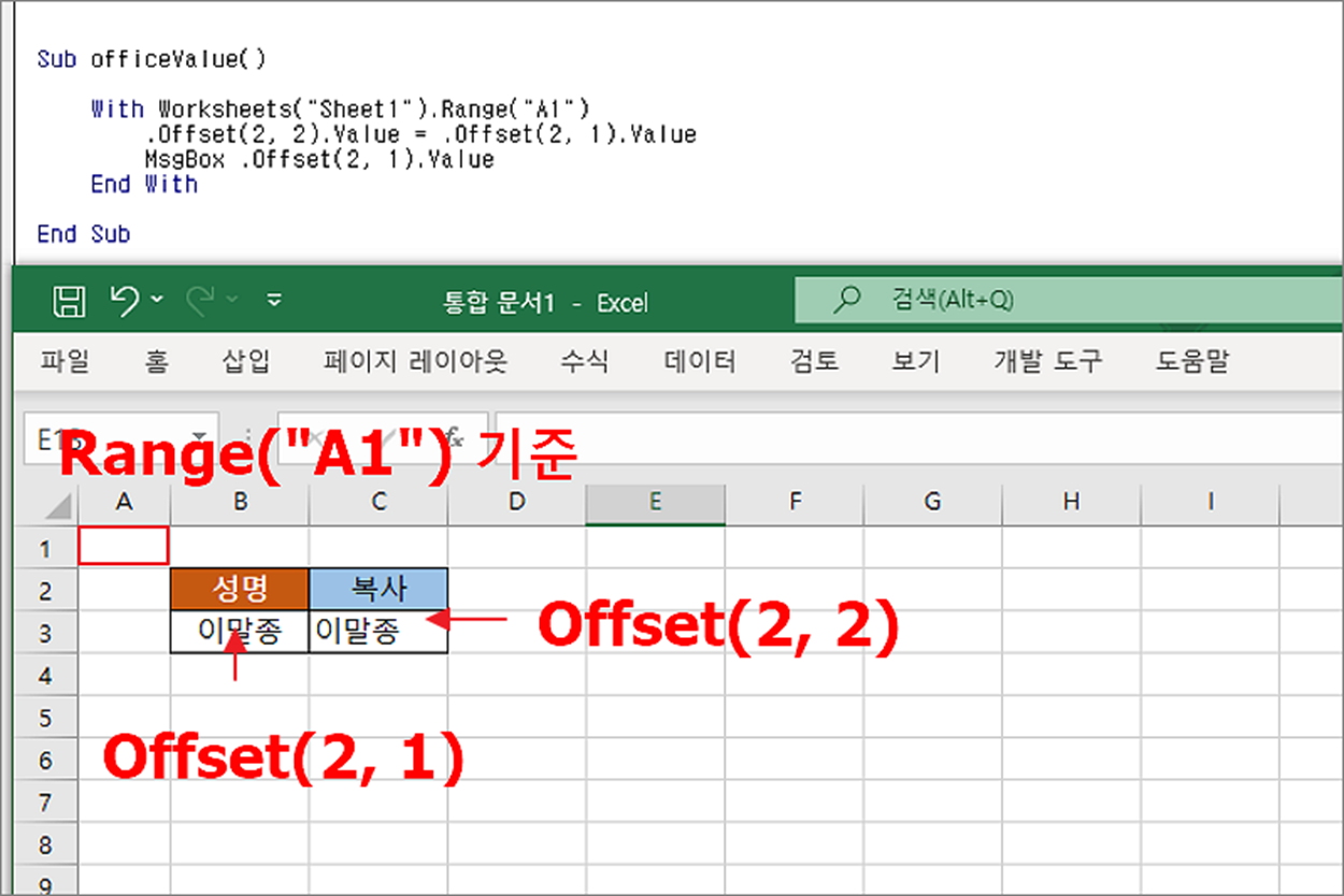 ▼ 세 번째는 Offset 함수입니다. Offset 도 Range 개체의 Cells 과 마찬가지로 해당 개체의 상대적인 위치를 나타냅니다. Range 에서 사용한 Offset 는 Range 위치를 기준으로 매개변수에 입력한 값만큼 좌/우, 위/아래로 이동한 뒤 해당 셀에서 값을 가져옵니다. Range 의 Cells 와 달리 Offset 는 기준인 Range 개체의 위치가 0, 0 입니다. 그러니까 Offset(2, 1) 이면 아래로 2칸, 오른쪽으로 1칸 이동하라는 뜻입니다.