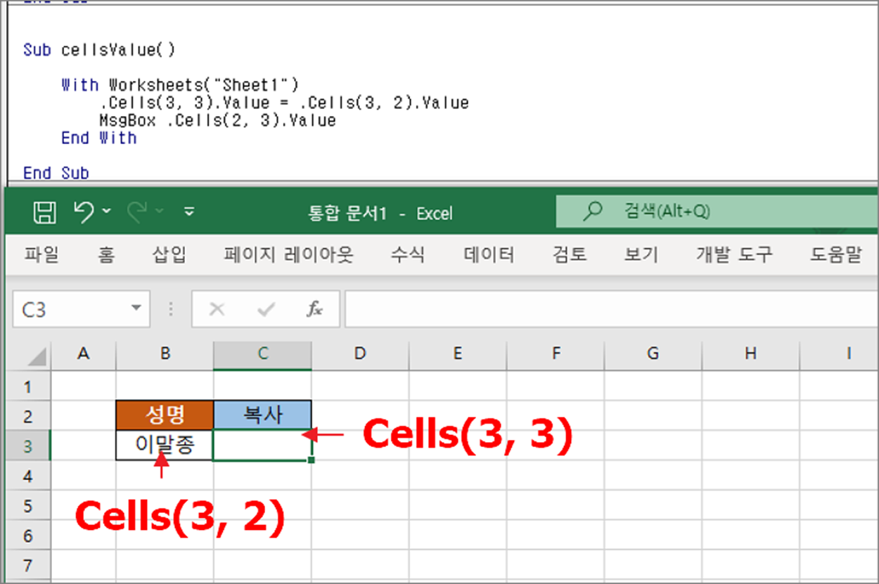 Range 개체에 포함된 Cells 함수도 있습니다. Cells 함수는 해당 Range 개체가 지정한 셀에서 상대적인 위치를 가리킵니다. Range 개체를 기준으로 좌/우, 위/아래 로 이동해서 해당 셀의 값을 가져옵니다. Worksheets("Sheet1").Cells(3, 2).Value 는 Range(“A1”).Cells(3, 2).Value 와 같습니다.