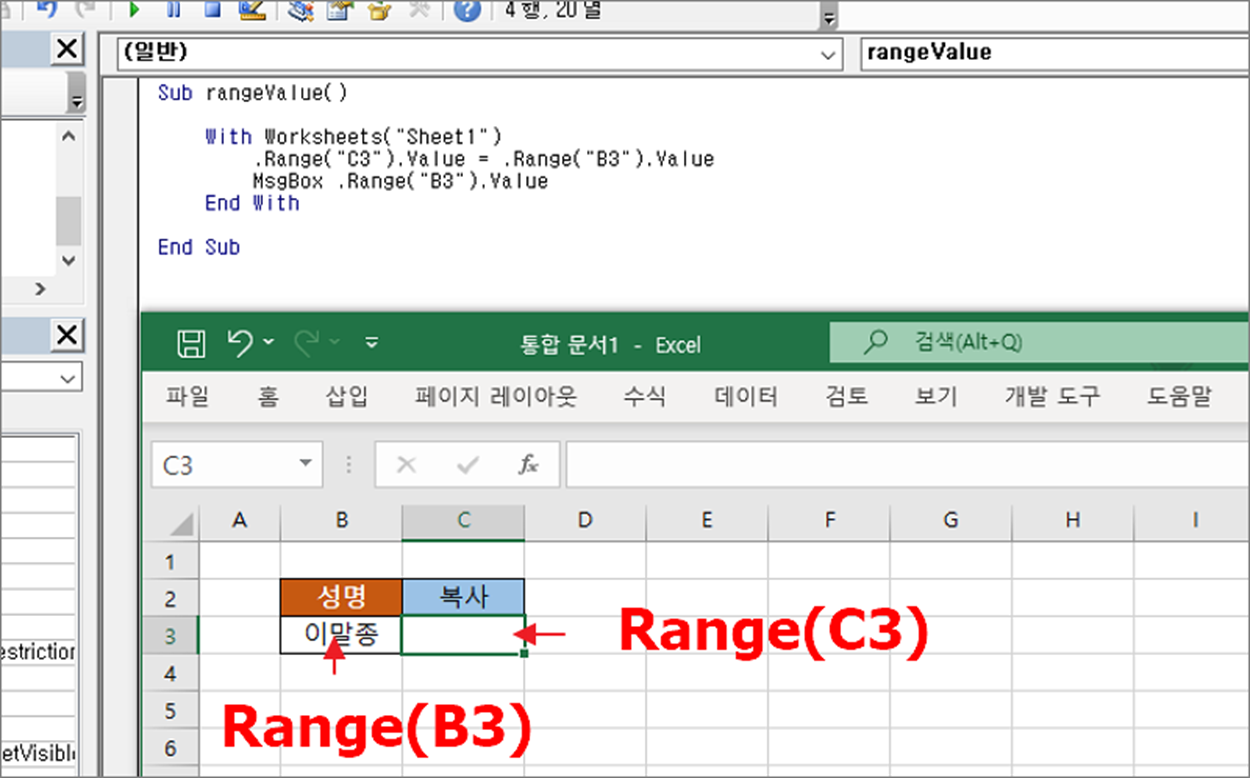 ▼ 첫번째는 Range 함수입니다. 매개변수로 행과 열 번호를 합친 주소를 입력하면 셀에 포함된 값을 반환합니다. 만약 Range("A1:B2") 과 같이 영역을 지정하면 Range 영역 개체를 반환합니다.