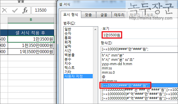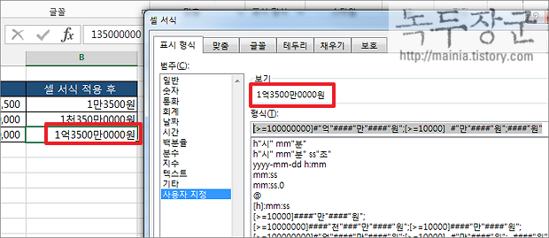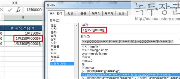 ▼ 그런데 보다 큰 금액에 같이 적용했더니 생각한 것과 다른 결과가 나왔습니다. 왜냐하면 10,000 보다 크거나 같은 금액은 전부 동일한 결과를 가져오도록 형식을 만들었기 때문입니다. 이 때는 경우의 수를 더 만들어야 합니다. 백만, 억 단위가 나왔을 때 어떻게 표현할지 다중 분기를 만들어야 합니다. 사용자 지정에서 다중 분기는 “;” 콜론으로 구분해서 나열하면 됩니다.