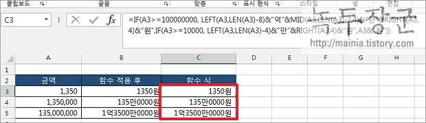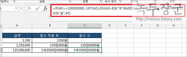 ▼ 두 번째 수식에 들어간 함수들은 텍스트를 자르기 위한 LEFT, MID, RIGHT, LEN 을 사용하였습니다. 억에 해당하는 값을 자르기 위해 LEN 함수로 전체 길이를 측정한 후 “억” 에 해당하는 자리수를 빼 주는 것이죠. 이렇게 나머지 단위의 값도 잘라 내서 합치면 됩니다.