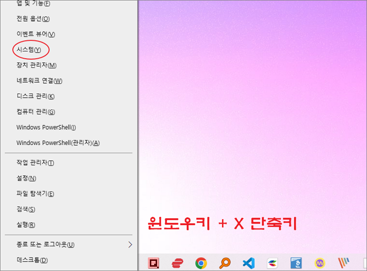 ▼ 먼저 복원을 하려면 복원지점이 설정되어 있는 시스템 설정 페이지로 가야 합니다. 시스템 페이지는 단축키 윈도우키 + X 를 눌러 [고급 기능 메뉴]를 띄웁니다. 그리고 고급 기능 메뉴 안에 [시스템]을 선택합니다.