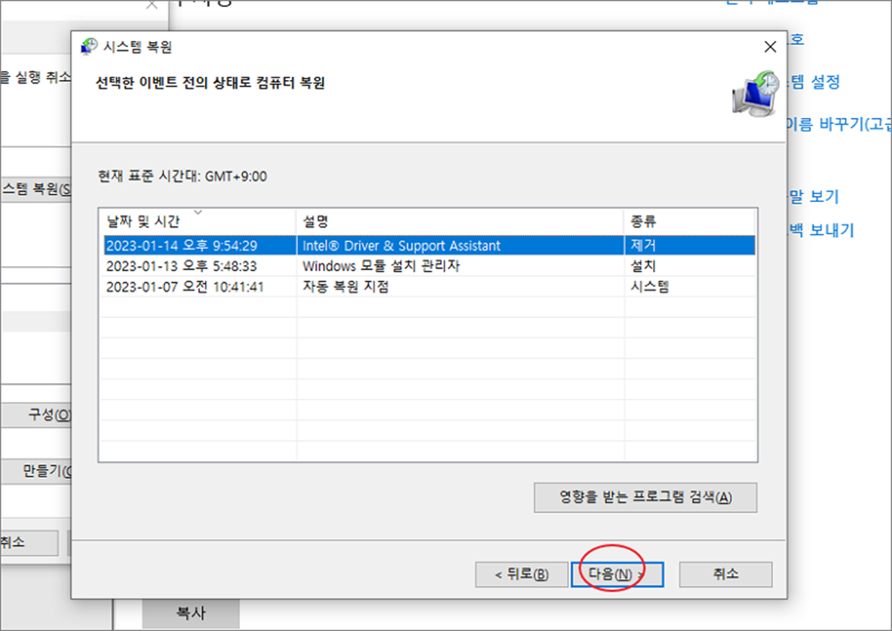 ▼ 두 번째는 현재까지 만들어진 복원지점 리스트 중 하나를 고릅니다. 복원하고 싶은 지점을 선택한 뒤 [다음]을 누릅니다. 다음을 누른다고 해서 바로 시작되는 것은 아닙니다.