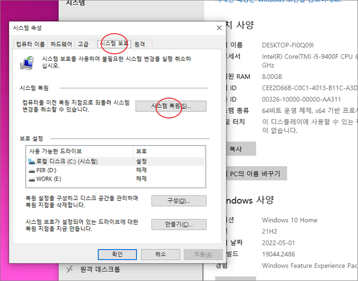 ▼ 시스템 속성 팝업이 뜨면 시스템 보호 탭으로 갑니다. 시스템 복원은 드라이브의 보호가 설정으로 되어 있어야 하며, 복원지점이 하나라도 생성이 되야 합니다. 이전에 복원지점을 설정했다면 생성이 되어 있을 겁니다. 복원을 위해 [시스템 복원] 버튼을 클릭합니다.