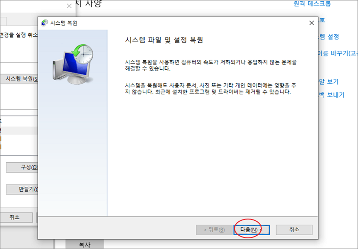 ▼ 시스템 복원을 위한 첫 번째 팝업창이 뜹니다. [다음]을 눌러 페이지 이동을 합니다.