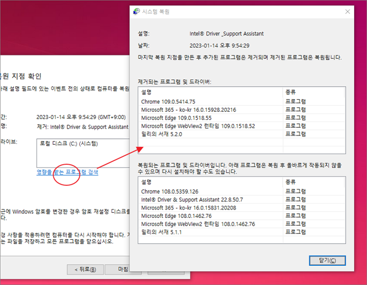 ▼ 마지막 단계에서 바로 복원하는 것이 아니라 어떤 프로그램에 영향을 주는지 확인합니다. 복원해도 영향을 주지 않는 드라이브나 프로그램이면 상관없겠지만 문제가 생길 것 같으면 복원지점을 변경해 줍니다.