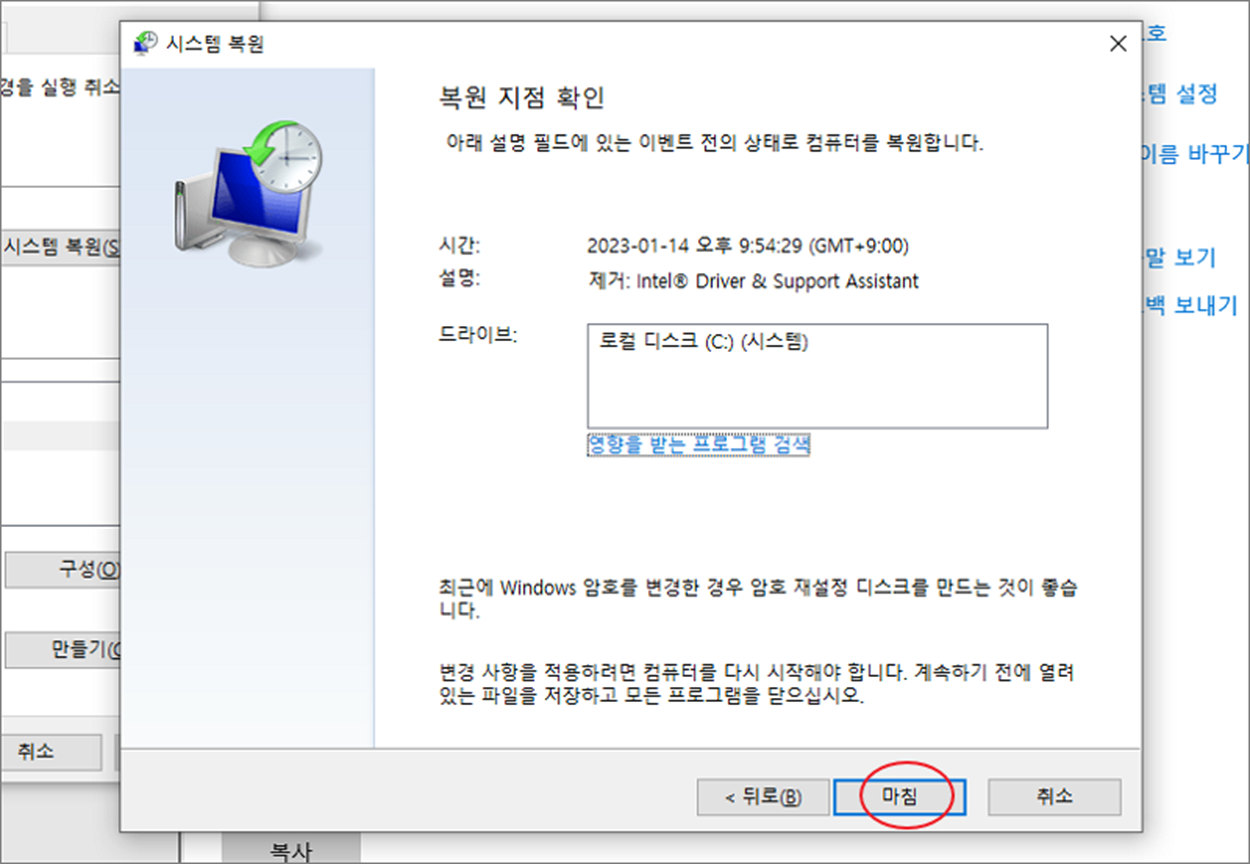 ▼ 복원지점에서 영향을 주는 프로그램까지 확인했다면 마침 버튼을 눌러 복원을 시작합니다.