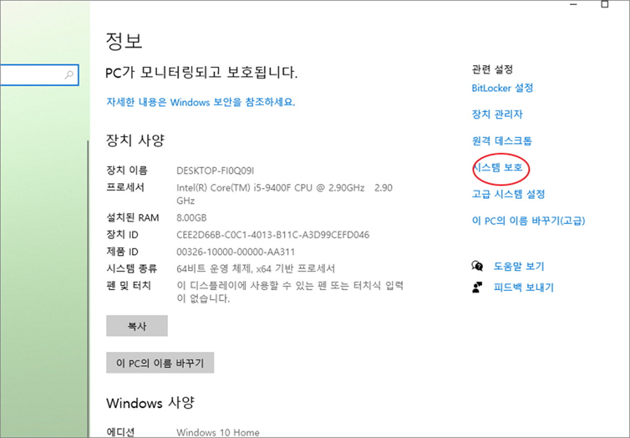 ▼ 시스템 페이지에서 다시 오른쪽 관련 설정 항목에 [시스템 보호] 메뉴를 선택합니다.
