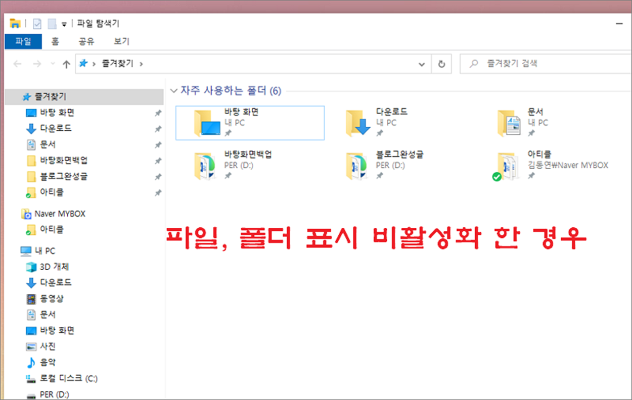 ▼ 개인 정보 보호 에서 최근에 사용한 파일이나 폴더 표시를 해제해 주었다면 아래 그림처럼 탐색기를 띄웠을 때 나타났던 [최근 사용한 파일] 목록이 보이지 않을 겁니다.