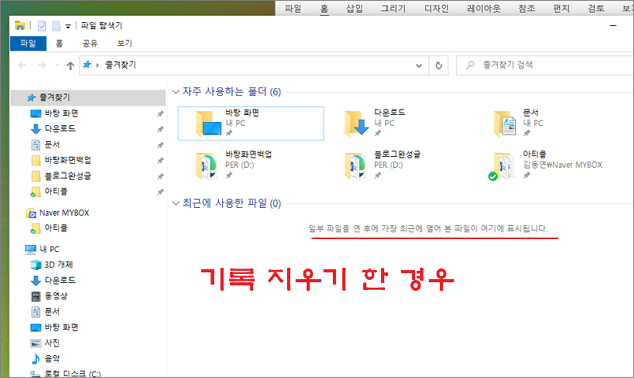 ▼ 만약 최근에 사용한 파일 목록은 그대로 두고 기록한 삭제한 경우는 아래와 같습니다.