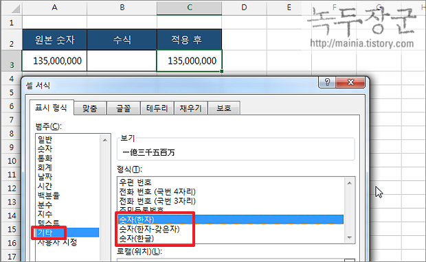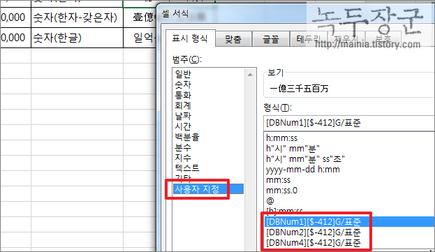 ▼ 3가지 형식을 적용 후 사용자 지정으로 가시면 식 자체를 볼 수 있습니다. DBNum1 에서 DBNum4 중에 하나를 사용한 것입니다. 숫자를 한글이나 한자로 변경하고자 할때 [기타] 에서 선택하거나 [사용자 지정]에서 직접 식을 입력하셔도 됩니다.