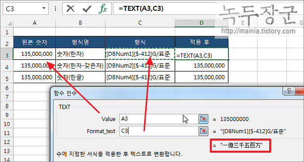 엑셀 Excel 숫자 단위 한글로 표시하는 방법, 만, 천 단위 표시