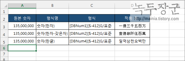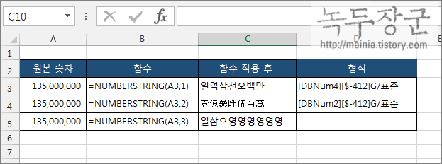 l NUMBERSTRING(A3,1): 1인 경우 숫자와 단위가 표시되고 형식은 [DBNum4][$-412]G/표준 와 동일합니다.