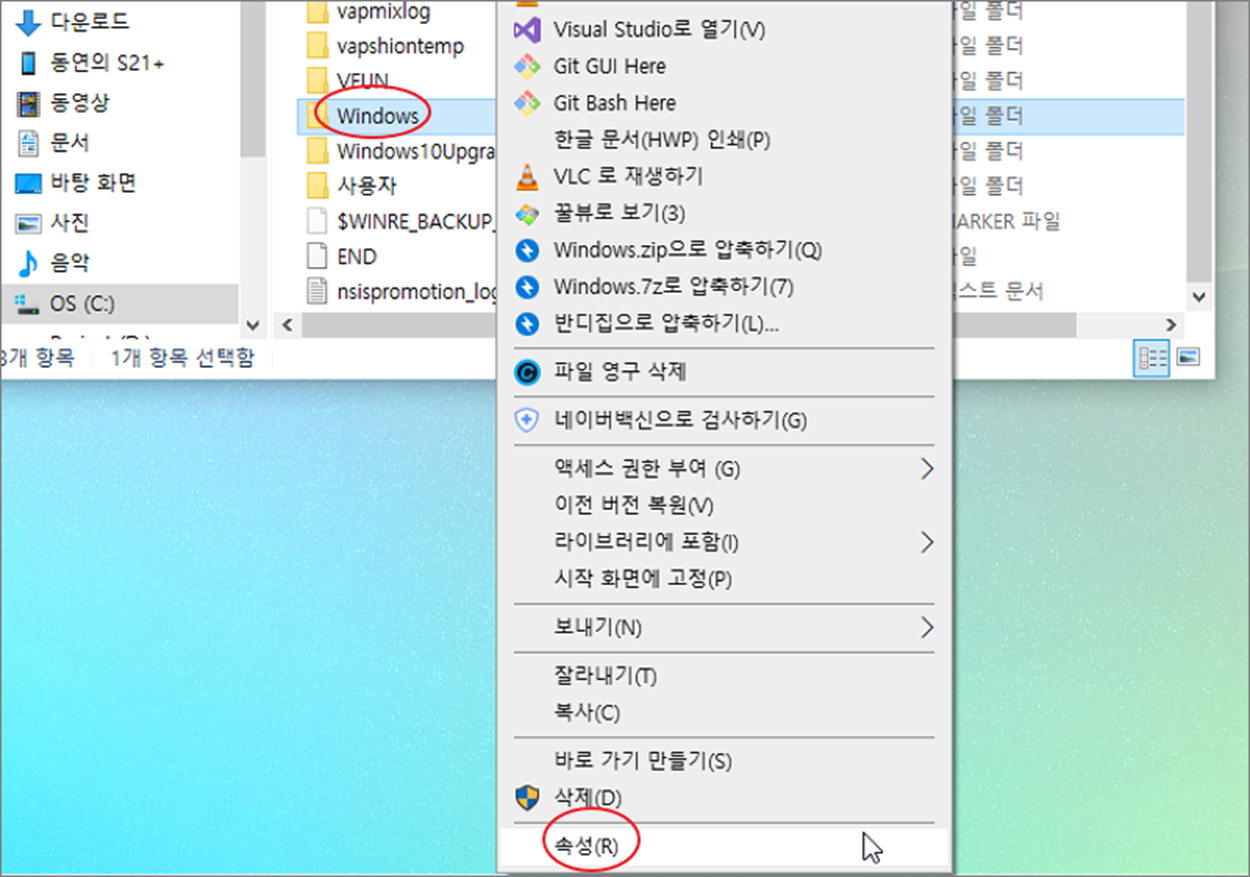 ▼ 윈도우가 설치될 때 추가되는 폴더를 선택하고 오른쪽 마우스 > 속성 메뉴를 클릭합니다.