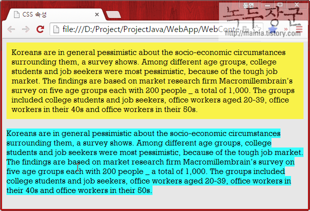 ▼ 아래 샘플처럼 div, span 태그로 동일한 문장을 감쌌습니다. 결과 화면을 보면 차이가 있죠. div 는 박스 형태로 영역이 설정되고 그 안에 정렬됩니다. 하지만 span 은 줄 단위로 영역이 설정되기 때문에 배경색의 길이가 틀리죠. 그리고 div 는 width, height 크기 지정이 가능하지만 span 은 inline 속성을 가지기 때문에 정해 줄 수 없습니다.