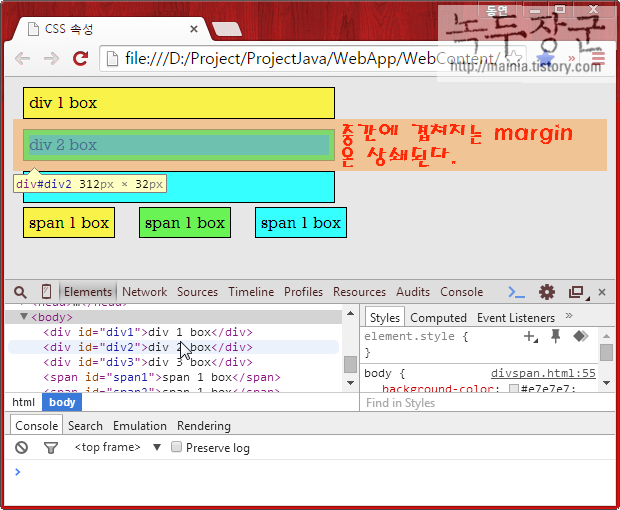 ▼ 또 다른 특이점은 div 의 margin 은 4방향 모두 적용이 되며 위 아래 겹쳐지는 여백은 상쇄됩니다. 그러니까 여백의 크기가 더해서 2배가 되는 것이 아니라 겹쳐지는 것이죠. 그런데 span 의 margin 은 양 옆으로만 적용되며 겹쳐지지 않습니다. 그래서 넓어 보입니다.