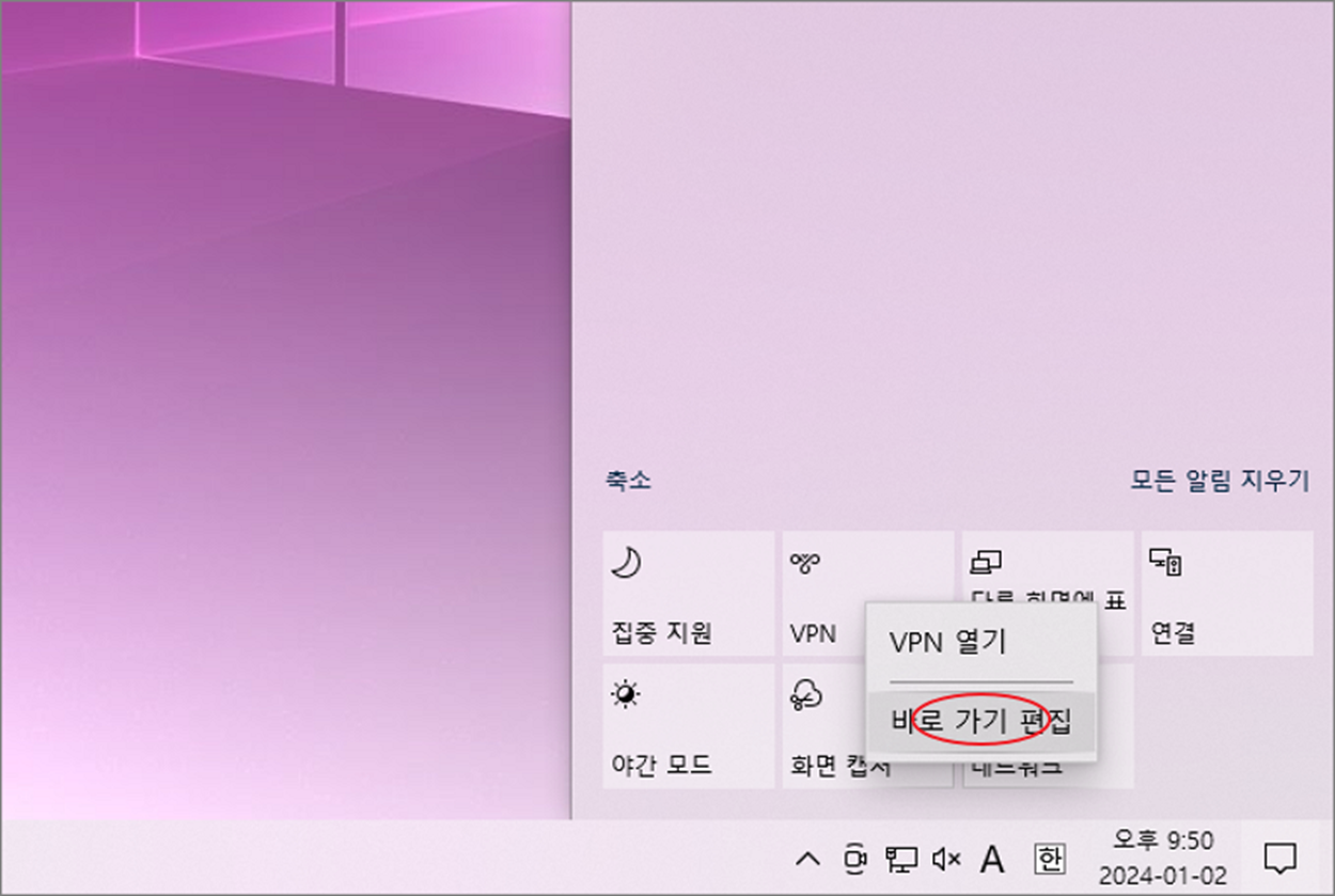 ▼ 알림 목록에서 오른쪽 마우스를 누릅니다. 그리고 “바로 가기 편집” 메뉴를 선택합니다.