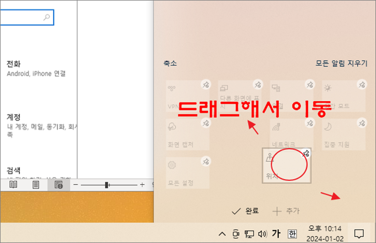 ▼ 목록은 마우스로 드래그해서 원하는 위치에 가져다 놓을 수 있습니다. 위치 변경이 완료되면 완료 버튼을 눌러서 작업을 종료합니다.