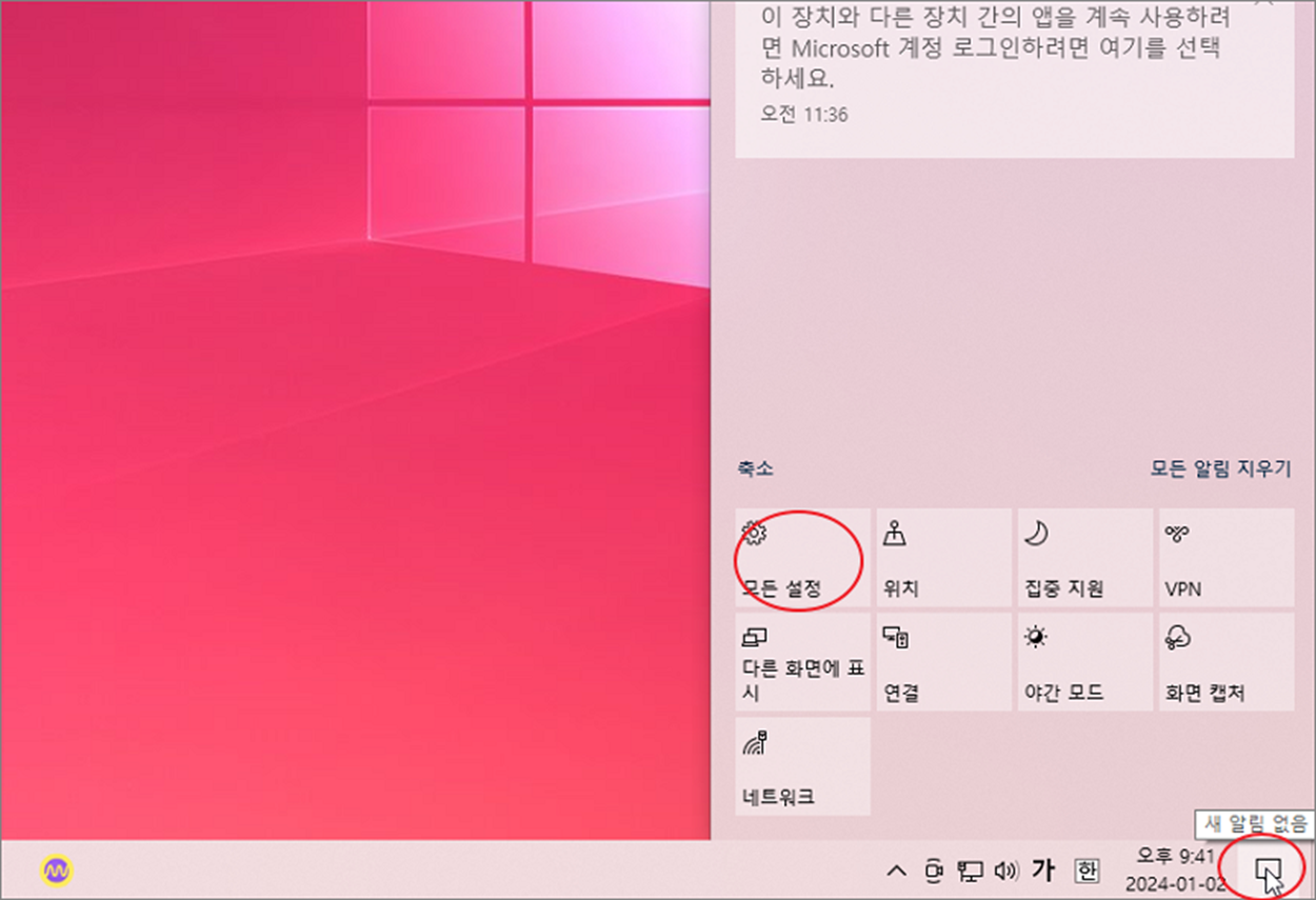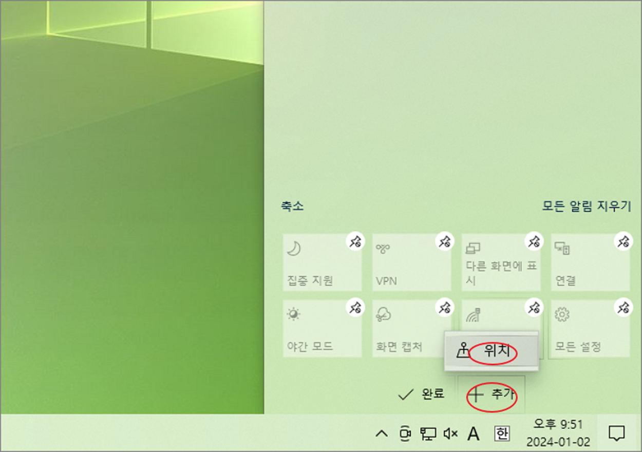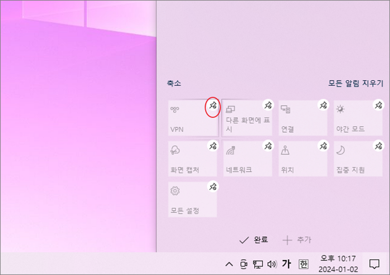 ▼ 윈도우키 + A 나 작업관리자 오른쪽 끝에 있는 알림센터 아이콘을 클릭해서 창을 엽니다. 알림 창이 열리면서 하단에 메뉴 목록이 나옵니다. 불필요한 것들을 삭제하거나 추가해서 메뉴 목록을 편집해 보겠습니다.