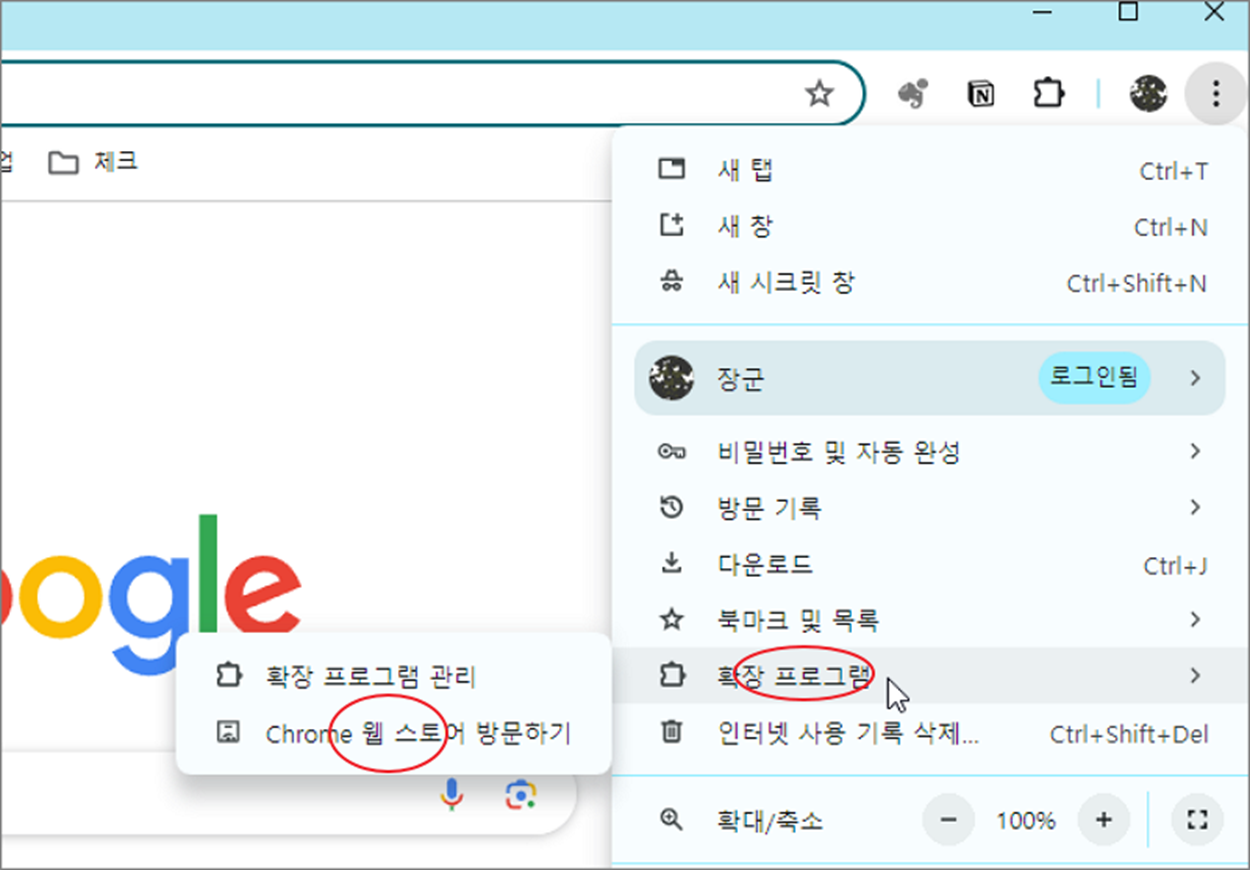 ▼ 화면 잠금 확장 프로그램을 설치하기 위해 오른쪽 상단에 있는 더보기 아이콘을 클릭합니다. 그리고 [더보기] > [확장 프로그램] 메뉴에서 "Chrome 웹 스토어를 방문하기" 메뉴를 선택합니다.