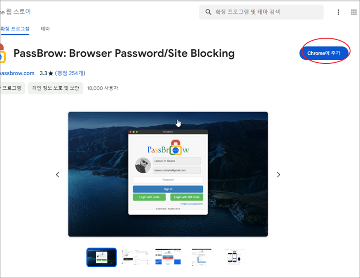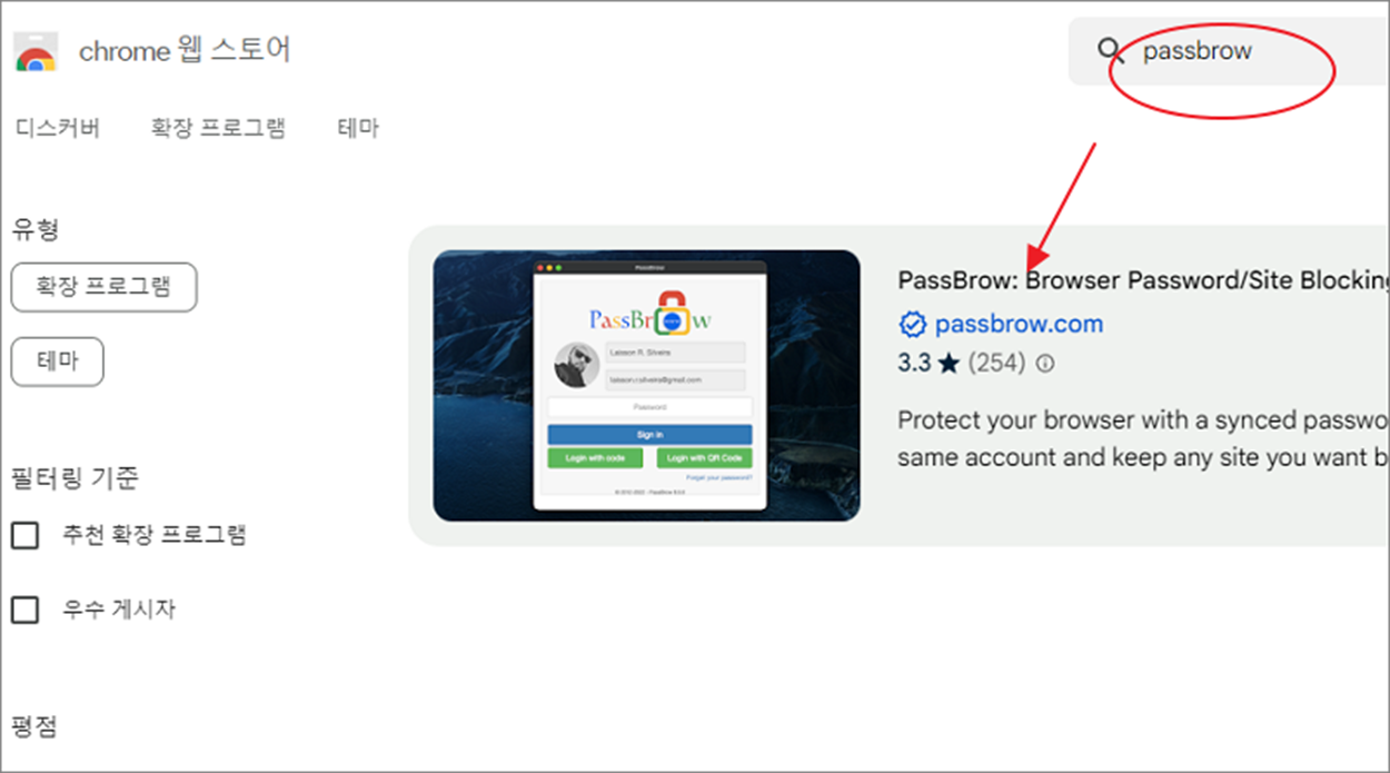▼ 구글 웹 스토어에서 PassBrow 입력합니다. 그리고 검색된 확장 프로그램 PassBrow 를 클릭합니다.