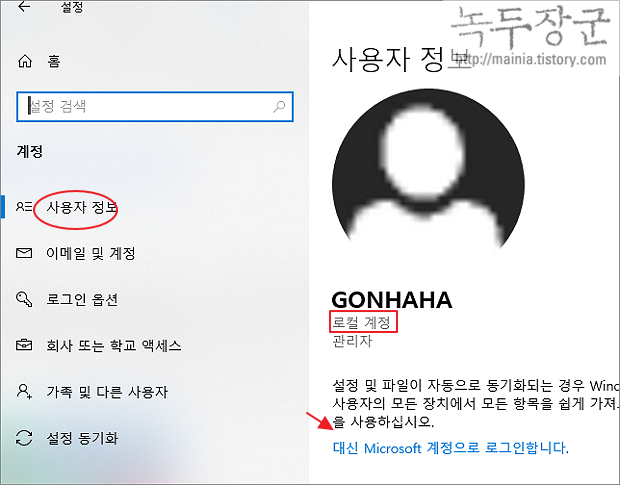 ▼ [로컬 계정 사용] 페이지에서 입력이 끝났다면 아래 그림처럼 계정 정보란에는 마이크로소프트 이메일 계정이 아닌 [로컬 계정]으로 변경이 되어 있을 겁니다. 이제 인터넷이 접속되어 있지 않더라도 로그인이 가능하겠죠.