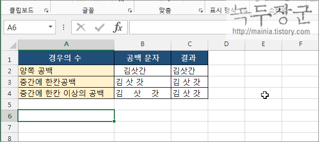 ▼ 아래 그림과 같이 앞 뒤로 공백이 생겼습니다. 이 데이터를 가지고 TEXT 관련 함수를 사용하면 공백을 하나의 문자로 인식하기 때문에 제거해 줘야 합니다. 그리고 정렬이 되지 않아서 가독성에도 문제가 있습니다.