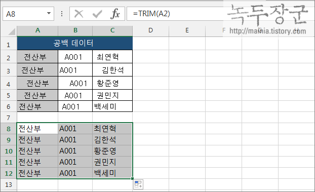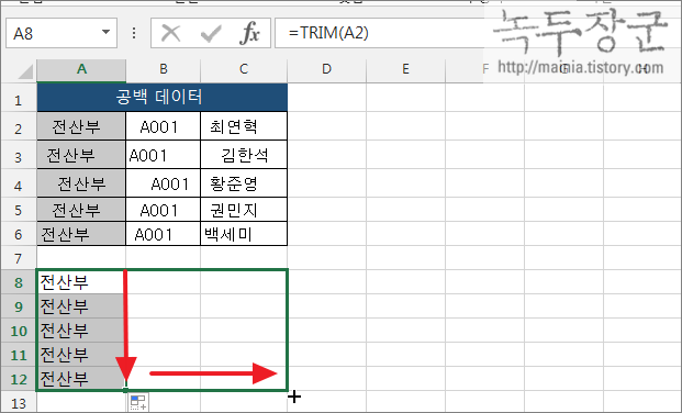▼ 두 번째는 TRIM 함수를 이용하는 것입니다. 붙여넣기 한 데이터를 변경할 영역을 선택합니다. 그리고 첫 번째 셀에 TRIM() 함수를 넣고 데이터의 공백을 제거합니다. 제거한 첫 번째 셀에서 아래로 드래그해서 A 열 데이터의 모든 공백을 제거합니다. 다음은 오른쪽으로 드래그 해서 데이터 영역까지 끌어다 놓으면 끝납니다.