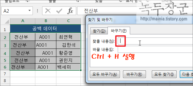 ▼ 첫 번째 텍스트 데이터 양 쪽에 있는 공백을 제거하기 위한 방법은 “바꾸기” 기능입니다. 찾기와 바꾸기 기능은 문서 프로그램 사용하다 보면 아주 자주 사용하는 기능입니다. 한번에 찾아 바꿀 수 있기 때문에 아주 편리하죠. 바꾸기 창을 띄우기 위해서 단축키 Ctrl + H 를 클릭합니다. 그리고 [찾을 내용]에 스페이스바를 눌러 한 칸 띄웁니다. 바로 아래에 있는 [바꿀 내용] 은 그대로 두세요. 바꿀 내용을 입력했다면 [모두 바꾸기] 버튼을 클릭합니다. 만약 텍스트 중에 공백이 들어가야 하는 부분이 있다면 [다음 찾기] 와 [바꾸기] 로 하나씩 변경해야겠죠.