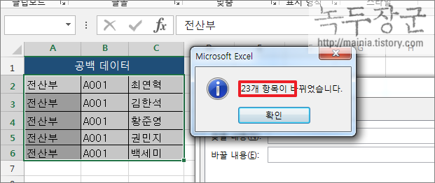 ▼ [모두 바꾸기]를 클릭하게 되면 공백을 없앤 항목들이 몇 개인지 보여 줍니다. 이렇게 팝업창으로 보여 주는 개수를 통해 잘못 바꾼 데이터가 있는지 판단하시면 됩니다.