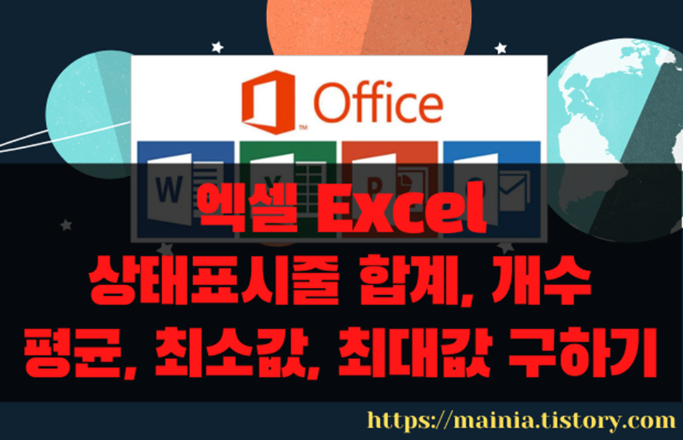 상태 표시줄은 마우스 위치에 정보를 상세하게 알려 주는 곳입니다. 엑셀에서 상태 표시줄을 잘 활용하면 간단한 수식은 구현하지 않고도 바로 결과값을 알 수 있습니다. 이곳에 표현되는 정보는 아주 다양합니다. 영역에 대한 합계, 개수, 평균, 최소값, 최대값을 바로 알 수 있습니다. 편리한 기능이므로 잘 활용하시기 바랍니다.