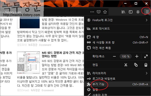 ▼ 먼저 확장 프로그램 설치방법부터 알아보겠습니다. 파이어폭스 오른쪽 상단에 더보기 > 부가 기능 메뉴를 선택합니다.