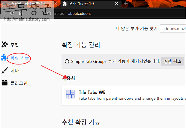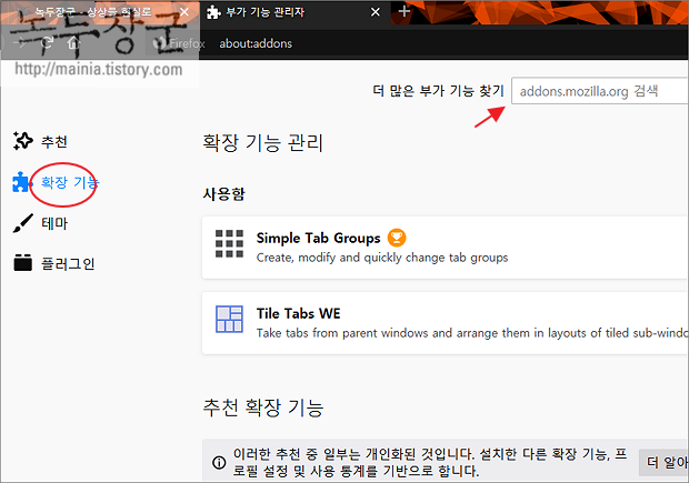 ▼ 부가 기능 페이지에서 확장 기능 메뉴를 선택합니다. 추천 확장 기능이나 설치하고 싶은 것이 있다면 상단 검색 기능을 이용해서 찾습니다.