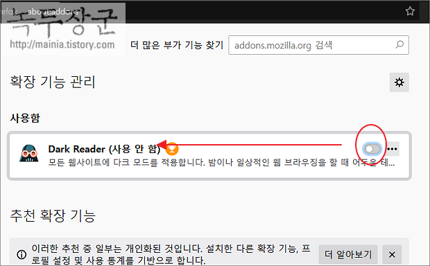 ▼ 삭제가 아닌 중지를 하고 싶다면 더보기 바로 옆 사용/사용 안함 스위치 버튼을 클릭해서 전환합니다.