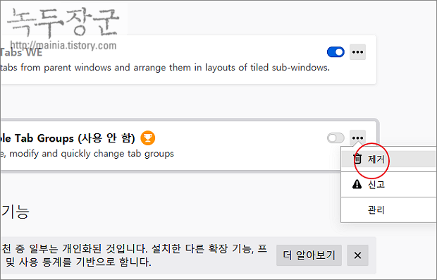 ▼ 삭제 대상 프로그램의 오른쪽 끝으로 가면 더보기 메뉴가 있습니다. 더보기 > 제거 메뉴를 클릭해서 확장 프로그램을 삭제합니다.