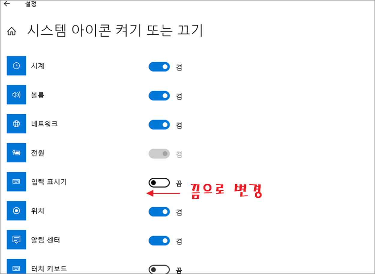 ▼ 작업 표시줄 오른쪽 끝에 나오는 여러 아이콘을 제어할 수 있는 설정 페이지에서 [입력 표시기] 가 켜져 있습니다. 이것을 꺼짐으로 바꿉니다. 그럼 X 버튼도 나타나지 않을 겁니다. 그 외에도 시계, 볼륨, 네트워크 등 굳이 볼 필요 없는 것들은 꺼짐으로 바꿔 줍니다.