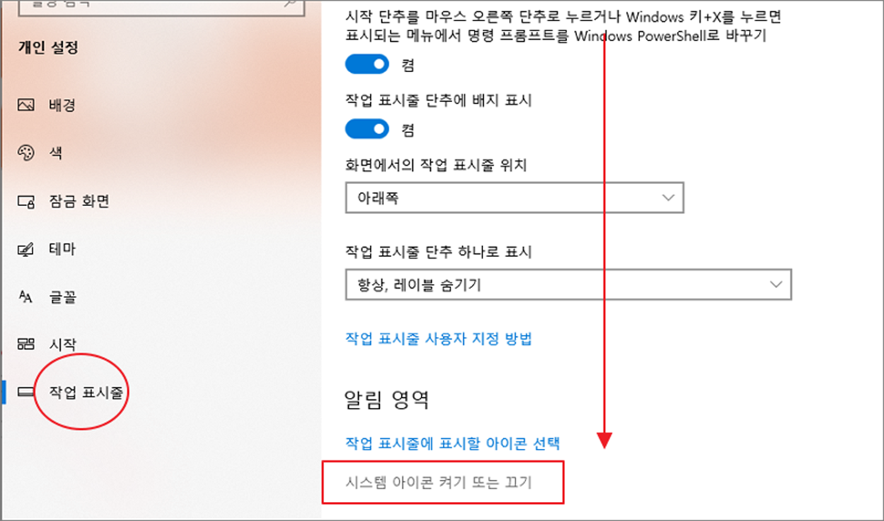 ▼ 다시 개인 설정 > 작업 표시줄 설정 페이지로 이동합니다. 오른쪽 페이지에서 아래로 내려가면 [시스템 아이콘 켜기 또는 끄기] 링크가 있을 겁니다. 링크를 클릭하면 작업 표시줄 아이콘들을 제어할 수 있는 페이지로 이동합니다.