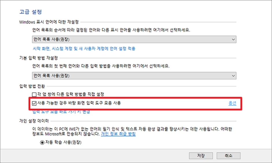 ▼ 고급 설정 화면에서 [입력 방법 전환] 섹션에 [사용 가능한 경우 바탕 화면 입력 도구 모음 사용] 이 체크 되어 있을 겁니다. 이것을 체크 해제하면 한영 전환이 안될 수 있습니다. 아이콘만 숨기려면 다시 오른쪽 끝에 있는 [옵션] 링크를 클릭합니다.