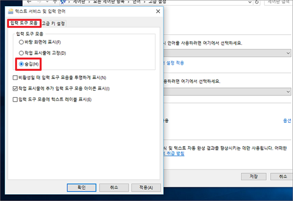 ▼ 그럼 입력 도구 모음에 관한 상세 설정 팝업창이 뜨게 됩니다. 팝업창에서 입력 도구 모음을 숨김으로 바꾸고 아래로 내려가 [적용] 버튼을 클릭합니다.
