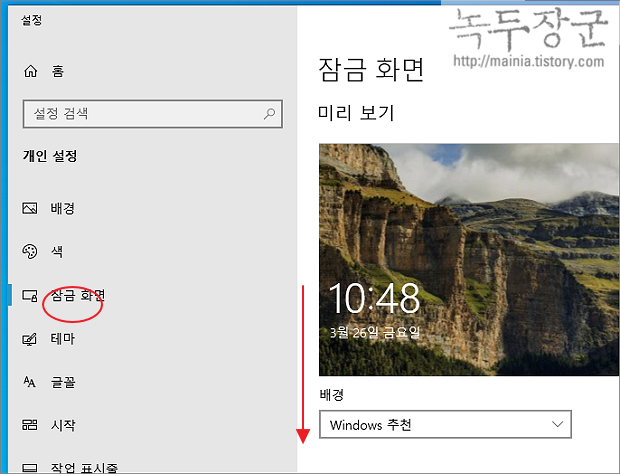 ▼ 개인 설정 페이지에서 왼쪽 사이드에 잠금 화면 메뉴를 선택합니다.