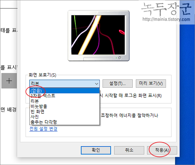 ▼ 화면 보호기 항목에 콤보 박스를 클릭합니다. 화면 보호기 목록에서 없음 을 선택하고 적용 버튼을 클릭합니다.