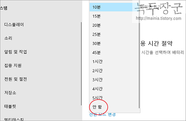▼ 시간 목록에서 제일 아래로 내려가 보세요. 안 함으로 선택하면 화면 전원을 끄지 않습니다.