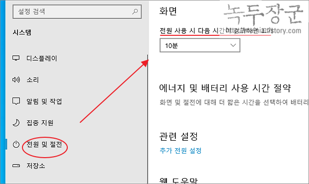 ▼ 화면 시간 제한 설정 링크를 클릭하면 전원 및 절전 화면으로 이동합니다. 오른쪽에 화면 항목으로 이동합니다. 바로 아래에 기본 10분으로 설정된 시간을 변경합니다.