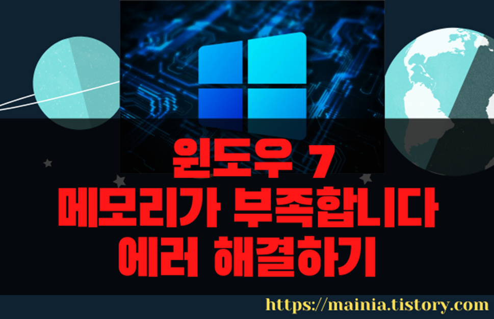 윈도우7을 사용하다 보면 컴퓨터 메모리가 부족하다는 메시지가 뜹니다. 이것은 가상 메모리 공간이 부족해서 발생하는 에러 메시지 입니다. 설정한 가상 메모리 크기가 작거나 하드 디스크 공간이 줄어들어 사용할 가상 메모리 공간이 없는 경우 발생합니다. 기본적으로 가상 메모리가 자동으로 늘어나도록 설정하는데, 부족하다는 메시지가 계속해서 뜬다면 최대값을 지정해 주는 것이 좋습니다. 윈도우7인 경우 컴퓨터에 설치된 메모리가 4기가 이상이면 가상 메모리를 설정하지 않아도 이런 메시지는 발생하지 않습니다.
