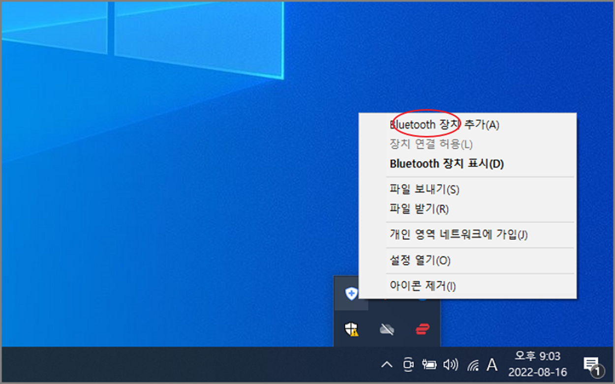▼ 블루투스 아이콘에서 오른쪽 마우스 > Bluetooth 장치 추가 메뉴를 클릭해서 윈도우 설정 페이지로 이동합니다.