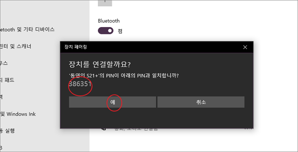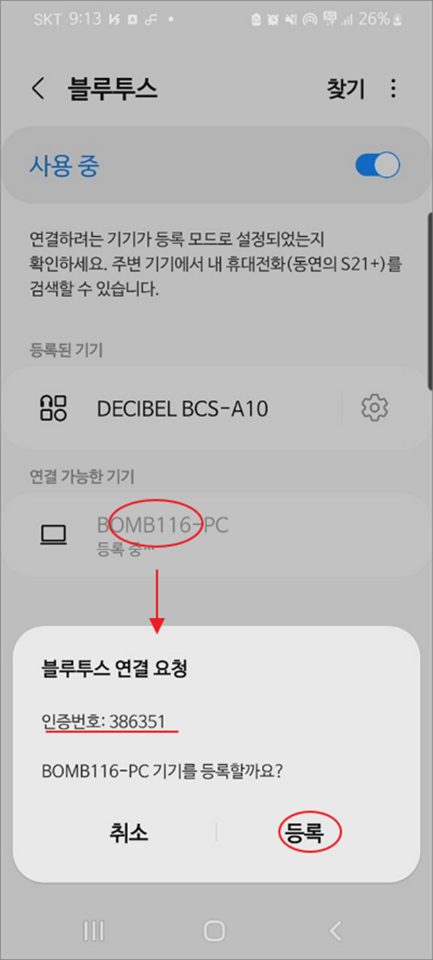 ▼ 스마트폰에서 전송한 핀번호와 메시지 창에 번호와 일치하는지 확인합니다. 이것은 해킹 방지를 위한 절차입니다. 만약 번호가 틀린다면 스마트폰에서 요청을 취소하면 됩니다.