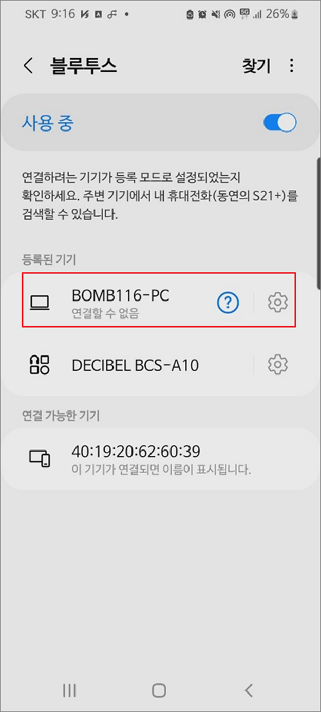 ▼ 상단에 블루투스 아이콘을 활성화합니다. 그리고 아이콘을 길게 눌러 설정 페이지로 이동합니다. 연결 가능한 기기 목록에 노트북이 보일 겁니다.