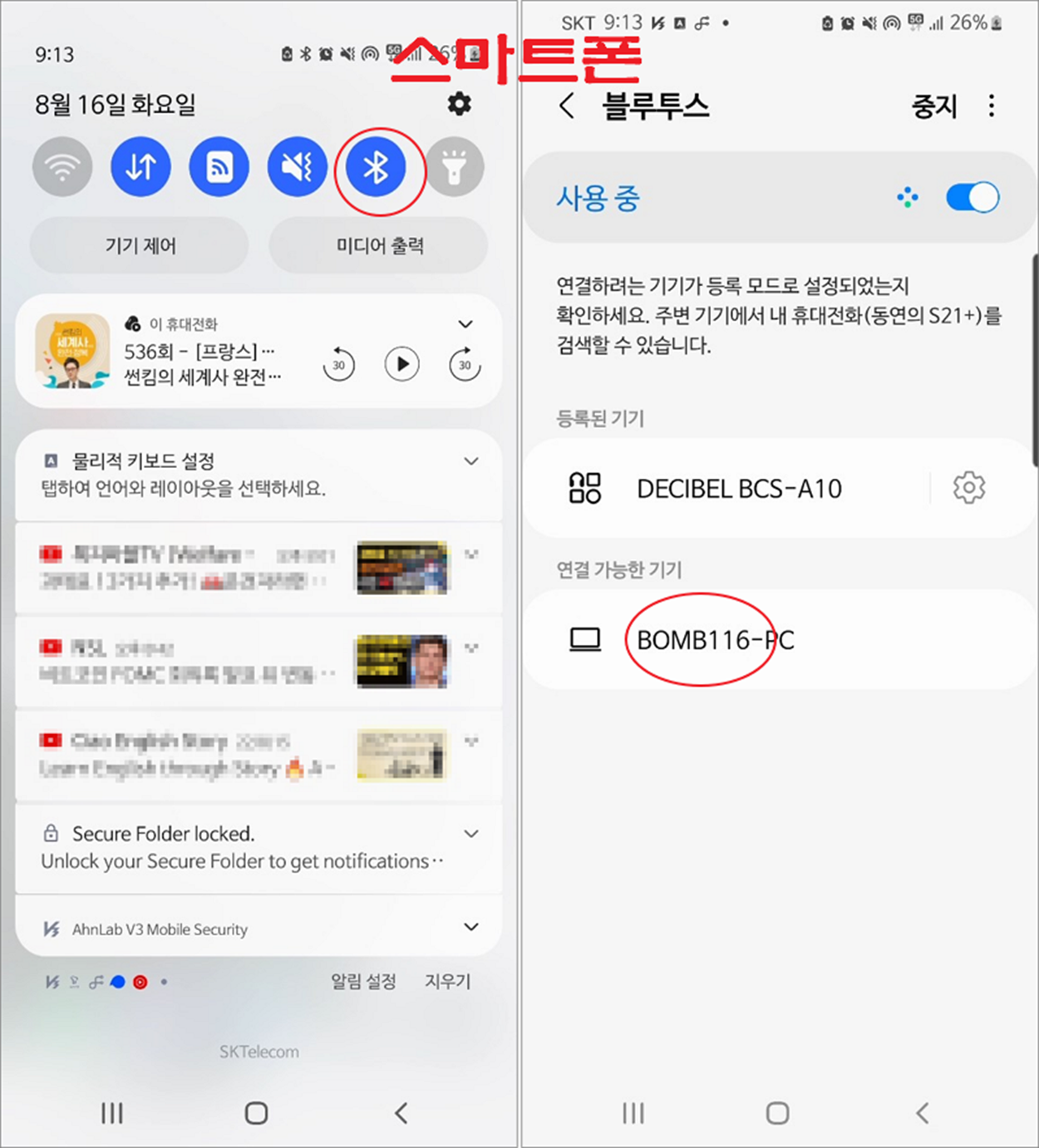 ▼ 스마트폰에서 연결 가능한 기기 노트북 이름을 클릭해서 연결 요청을 합니다. 인증 번호는 연결할 노트북에 표시한 번호와 일치하는지 확인할 숫자입니다.