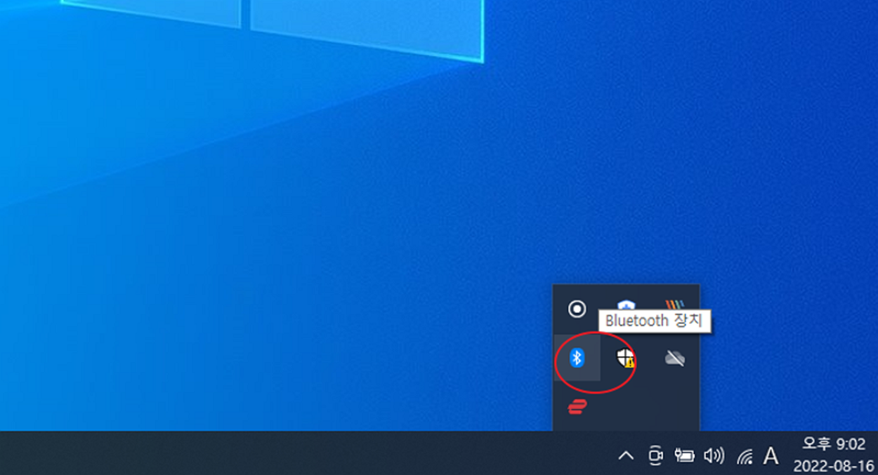 ▼ 먼저 스마트폰에서 노트북을 인식할 수 있도록 설정을 변경합니다. 작업 표시줄 숨겨진 목록 아이콘에서 블루투스를 찾습니다.