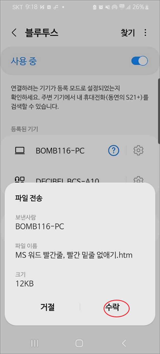 ▼ 스마트폰에서는 두 번의 요청을 수락해야 하는데 처음 연결할 때 노트북에 등록 요청을 수락하는 것과 파일 전송할 때 마다 건건이 수락을 해 줘야 전송이 가능합니다. 노트북에서 파일을 전송했다고 끝나는 것이 아닙니다.